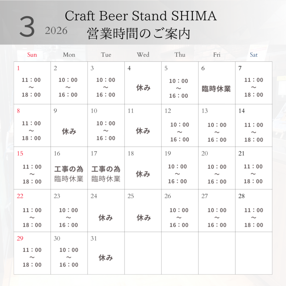2026年 3月 営業時間のご案内